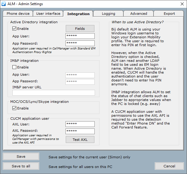 However, if your CallManager is configured to accept the Windows login name as the userID, then ALMPRO can automatically login the user’s phone without the need to enter a username or PIN.